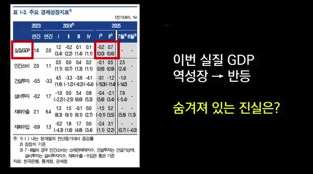 한국은행 보고서에 따르면 2분기 실질 GDP가 0.7% 상승했지만, 이 수치는 경제 회복의 신호가 아닙니다. 민간 소비와 투자는 오히려 감소했으며, GDP 상승은 일시적인 수출 및 수입의 급등 때문이었습니다.
