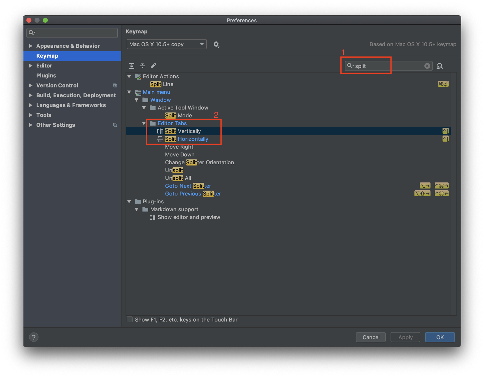 아래 그림에서 검색창에 split를 검색하면 보시는 것처럼 splite vertically & splite horizontally를 확인할 수 있습니다. 더블클릭해서 원하는 키 설정을 하시면 됩니다. 필자는 ⌃ + [ 요렇게 해서 사용하고 있습니다.